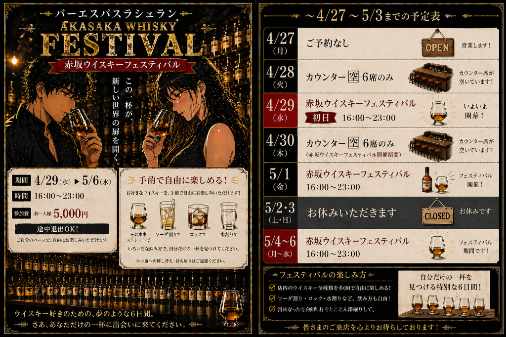 お知らせ news 2026/04/29 本日は赤坂ウイスキーフェスティバル初日 2026/04/27 4月27日(月)の営業録 2026/04/27 今日のテイスティングノート Read More 空間について about us Read More ウィスキーについて whiskey Read More コースについて course 歓送迎会プラン 時間∞★ウィスキー100種以上★個室確約♪ 5,000円 (税込) バースデープラン 時間∞★ウィスキー100種以上+季節の日本酒10種OK★個室確約♪ 5,000円 (税込) プレミアムプラン♪時間∞★ウィスキー100種以上★VIP個室確約♪ 7,000円 (税込) Read More 初めてご利用の方へ for beginner よくある質問 お客様の声 Read More