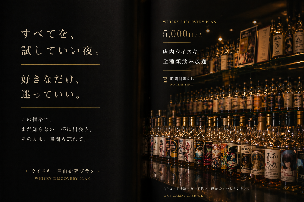 お知らせ news 2026/04/24 ~本日新着ウイスキー~ 2026/04/23 今日のハイライト 2026/04/23 今日のハイライト Read More 空間について about us Read More ウィスキーについて whiskey Read More コースについて course 歓送迎会プラン 時間∞★ウィスキー100種以上★個室確約♪ 5,000円 (税込) バースデープラン 時間∞★ウィスキー100種以上+季節の日本酒10種OK★個室確約♪ 5,000円 (税込) プレミアムプラン♪時間∞★ウィスキー100種以上★VIP個室確約♪ 7,000円 (税込) Read More 初めてご利用の方へ for beginner よくある質問 お客様の声 Read More