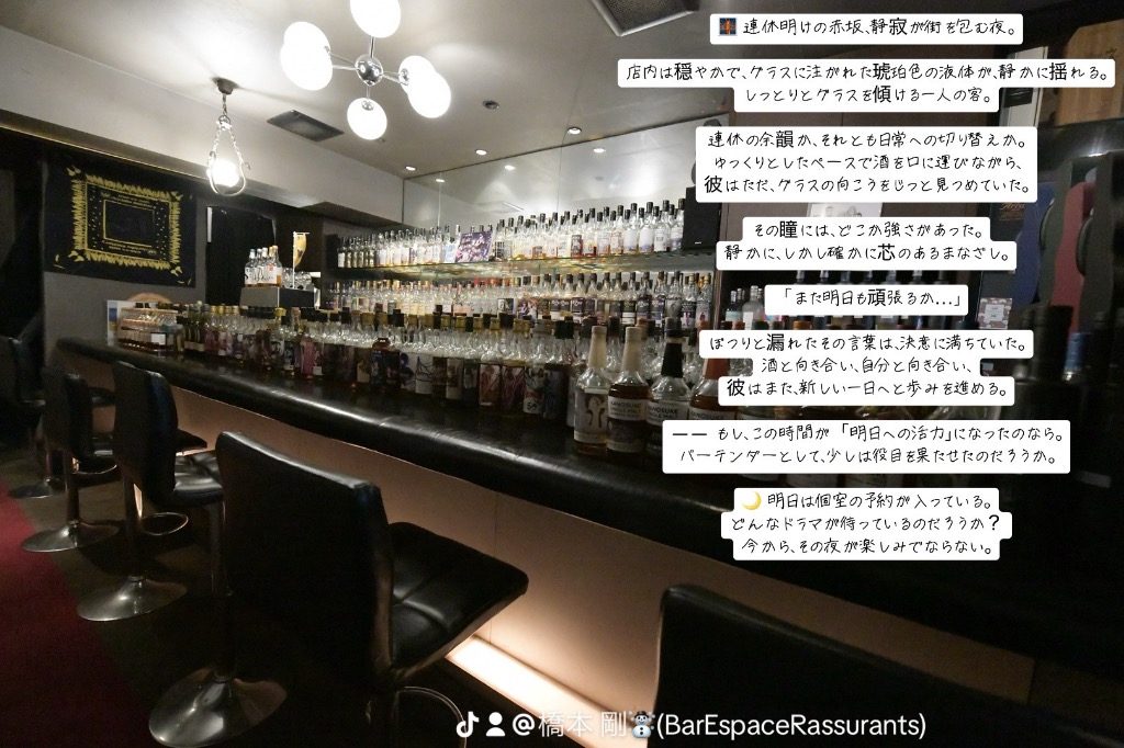 🔹 早い時間に最初の訪問者が静かにグラスを傾ける。🔹 少し間を空けて、次の登場人物がこの舞台に足を踏み入れる。🔹 そしてまた、ちょうど入れ替わるように、次の来客がカウンターに座る。