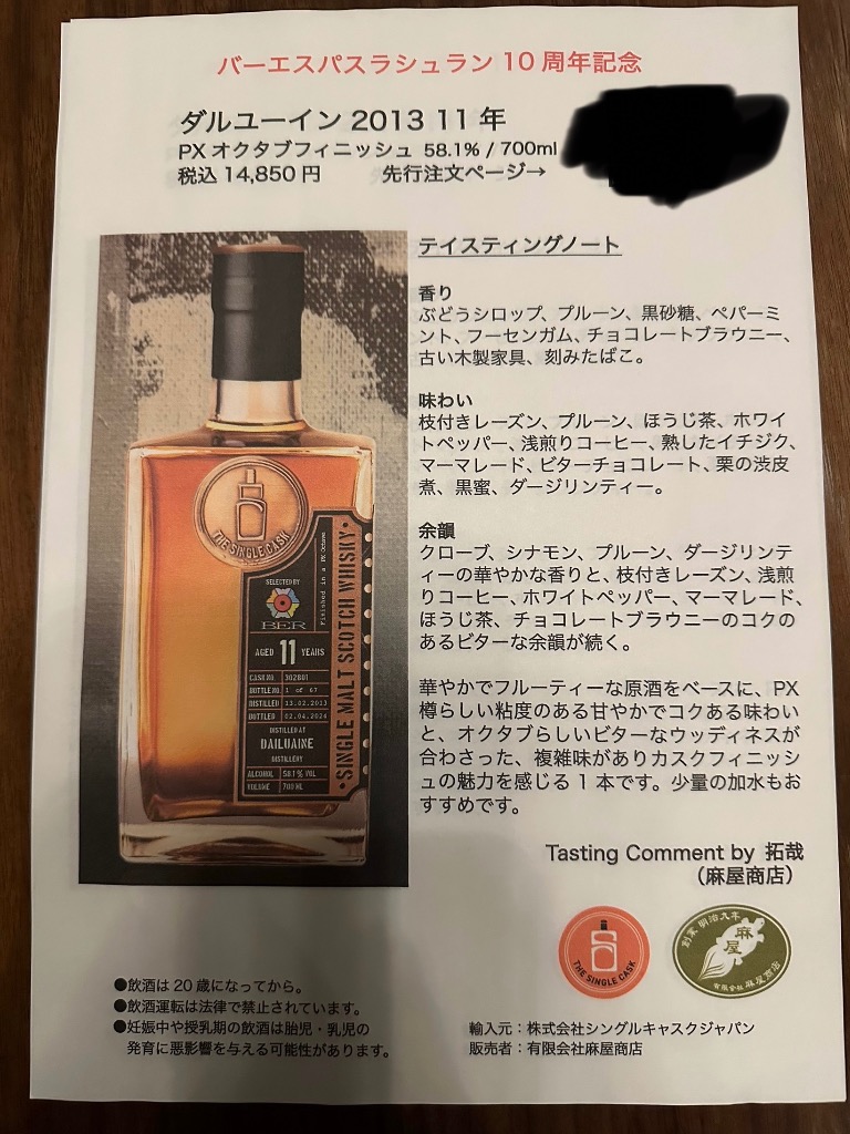 ウイスキー愛好家のために特別に選ばれた、 ダルユーイン2013 11年 PXオクタブフィニッシュ。