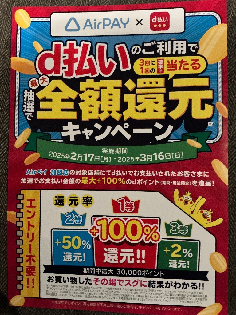 【最大100%還元!d払い×AirPAY全額還元キャンペーン】2025年2月17日スタート!